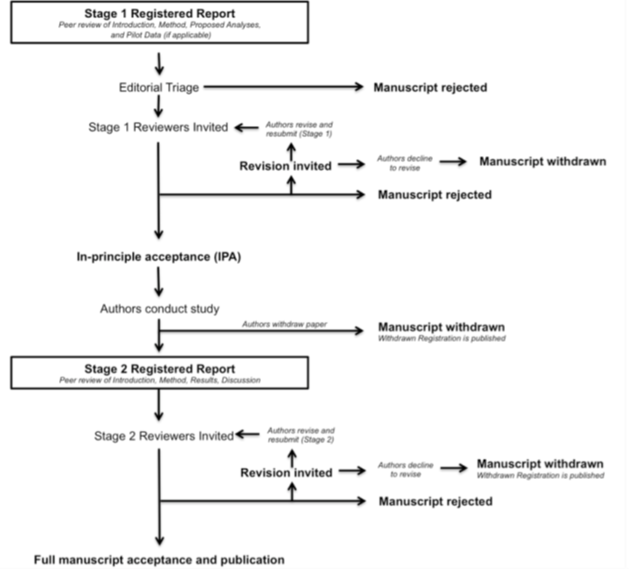 Stage 1: Peer review of the study protocol, including introduction, methods and analysis plan, occurs before the research is conducted (Chambers, 2019). The decision to publish is made before the study is run and is based on the importance of the research question and rigour of the methods. Authors receive an in-principle acceptance (IPA), a commitment from the journal to publish the study irrespective of the results.